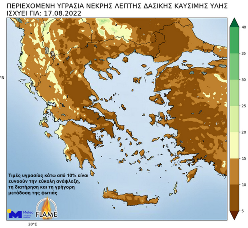 Στον χάρτη παρουσιάζεται η πρόγνωση της περιεχόμενης υγρασίας των νεκρών δασικών καυσίμων για την Τετάρτη 17/08/2022, οπότε και αυτή αναμένεται, μέσα σε διάστημα 2 ημερών, να πέσει κάτω από το 10 % στο μεγαλύτερο τμήμα της χώρας. Οι τιμές αυτές δημιουργούν ευνοϊκό υπόβαθρο για την εκδήλωση και την εξάπλωση δασικών πυρκαγιών.