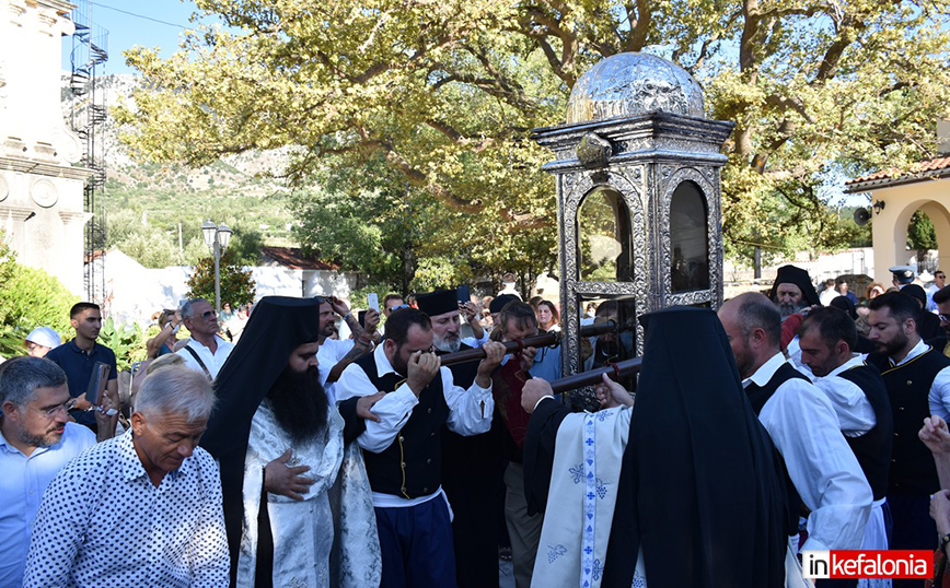 Μετά την παράκληση που τελέστηκε από τον σεβ. Μητροπολίτη Κεφαλληνίας Δημήτριο, οι άνδρες του Πολιτιστικού Συλλόγου Βαλσαμάτων «Ο Βάλσαμος», με τις παραδοσιακές του φορεσιές, σήκωσαν το σκήνωμα του Αγίου και το μετέφεραν από την μικρή στη μεγάλη εκκλησία.