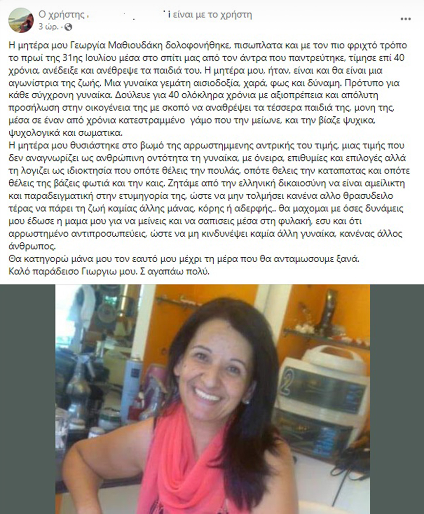 Αναλυτικά η ανάρτησή της: «Η μητέρα μου Γεωργία Μαθιουδάκη δολοφονήθηκε, πισώπλατα και με τον πιο φριχτό τρόπο το πρωί της 31ης Ιουλίου μέσα στο σπίτι μας από τον άντρα που παντρεύτηκε, τίμησε επί 40 χρόνια, ανέδειξε και ανέθρεψε τα παιδιά του. Η μητέρα μου, ήταν, είναι και θα είναι μια αγωνίστρια της ζωής. Μια γυναίκα γεμάτη αισιοδοξία, χαρά, φως και δύναμη. Πρότυπο για κάθε σύγχρονη γυναίκα. Δούλευε για 40 ολόκληρα χρόνια με αξιοπρέπεια και απόλυτη προσήλωση στην οικογένεια της με σκοπό να αναθρέψει τα τέσσερα παιδιά της, μόνη της, μέσα σε έναν από χρόνια κατεστραμμένο γάμο που την μείωνε, και την βίαζε ψυχικά, ψυχολογικά και σωματικά.