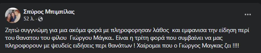 «Ζητώ συγγνώμη, για μια ακόμα φορά με πληροφόρησαν λάθος και εμφάνισα την είδηση περί του θανάτου του φίλου Γιώργου Μάγκα.. Είναι η τρίτη φορά που συμβαίνει να μας πληροφορούν με ψευδείς ειδήσεις περί θανάτων ! Χαίρομαι που ο Γιώργος Μαγκας ζει!!!!» έγραψε ο Σπύρος Μπιμπίλας.