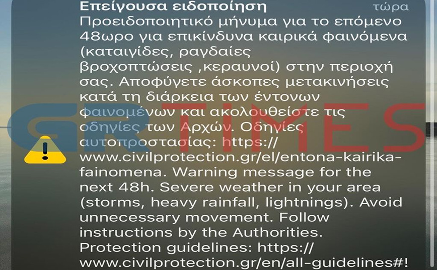 «Προειδοποιητικό μήνυμα για το επόμενο 48ωρο για επικίνδυνα καιρικά φαινόμενα (καταιγίδες, ραγδαίες βροχοπτώσεις, κεραυνοί) στην περιοχή σας. Αποφύγετε άσκοπες μετακινήσεις κατά τη διάρκεια των έντονων φαινομένων και ακολουθείστε τις οδηγίες των Αρχών» αναφέρει το μήνυμα του 112.