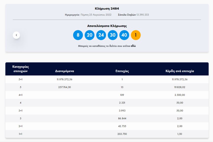 Οι τυχεροί αριθμοί λοιπόν, στη χθεσινή κλήρωση Τζόκερ είναι οι εξής: 8, 20, 24, 30, 40 και Τζόκερ το 1.