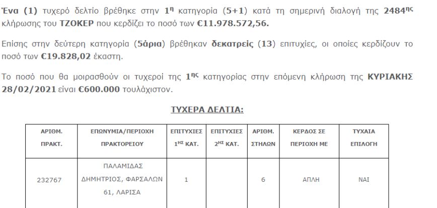 Το τυχερό δελτίο παίχθηκε στο πρακτορείο ΟΠΑΠ του Δημήτριου Παλαμίδα, που βρίσκεται στην οδό Φαρσάλων 61 στην πόλη της Λάρισας. Πρόκειται για ένα απλό δελτίο με 6 στήλες αξίας 3 ευρώ, με τα νούμερα που κερδίζουν να έχουν συμπληρωθεί σε μία στήλη από τυχαία επιλογή.