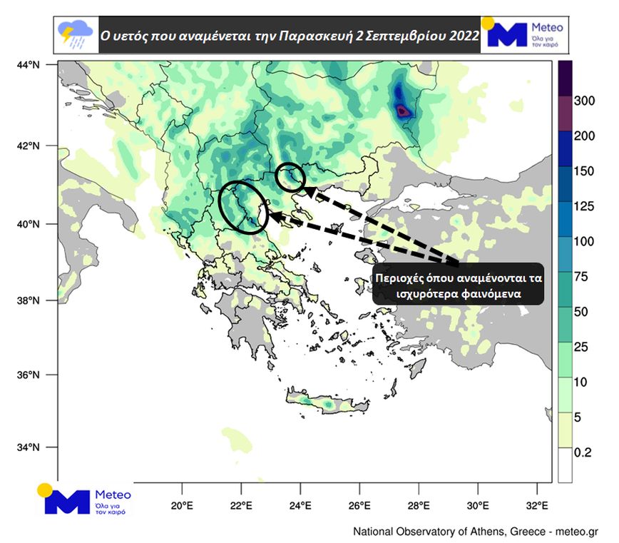 Στον χάρτη που ακολουθεί παρουσιάζεται ο υετός που αναμένεται την Παρασκευή 02/09 καθώς και οι περιοχές όπου αναμένονται τα ισχυρότερα φαινόμενα.