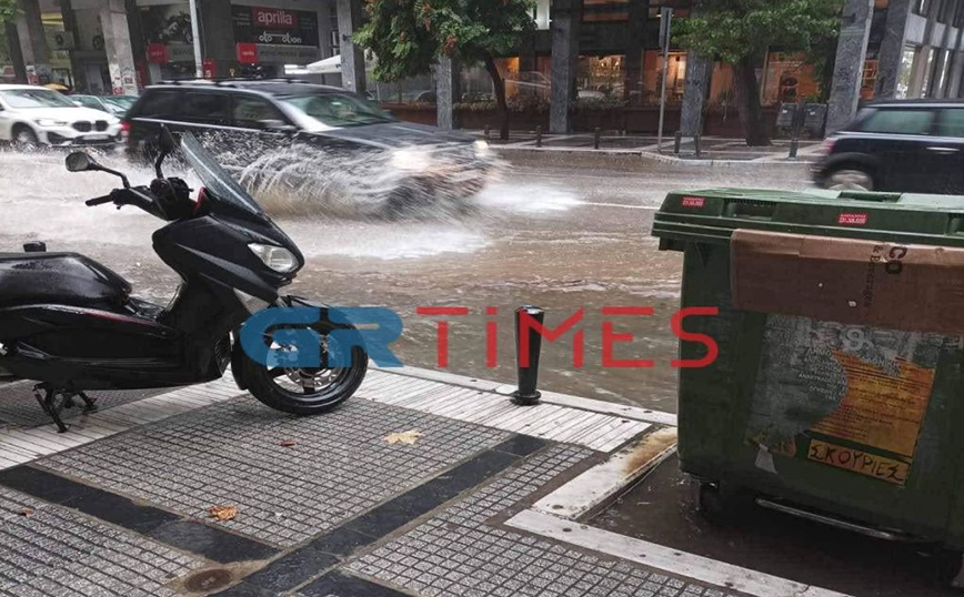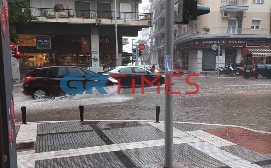 Μέσα σε λίγα λεπτά η οδός Τσιμισκή άρχισε να γεμίζει με νερό, με αποτέλεσμα τα φρεάτια να μην προλαβαίνουν να απορροφήσουν τη μεγάλη ποσότητα, την ώρα που οι πεζοί διασχίζουν με δυσκολία τον δρόμο. Η κίνηση των οχημάτων αυτήν την ώρα διεξάγεται με χαμηλές ταχύτητες αναφέρει το grtimes.
