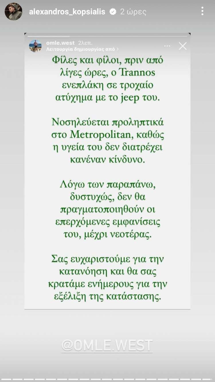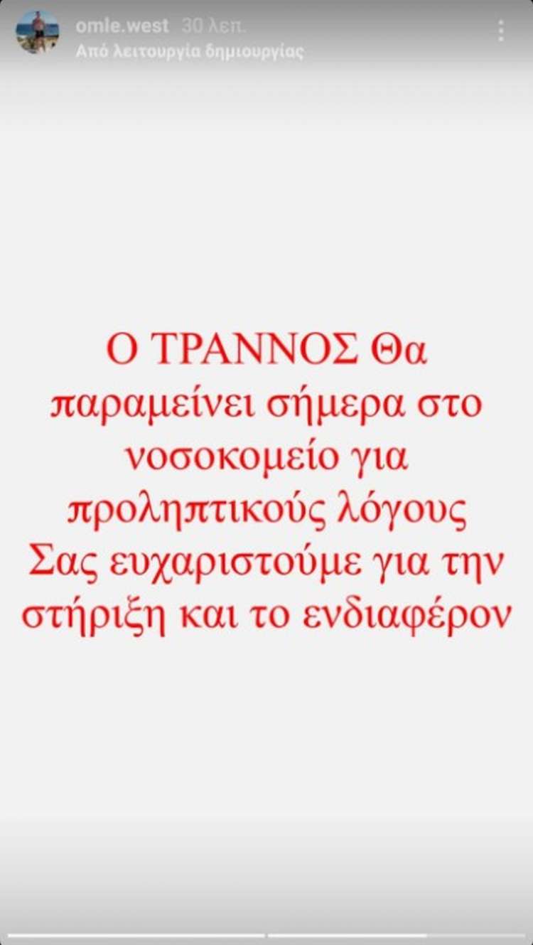 Τροχαίο είχε αργά το βράδυ της Παρασκευής ο γνωστός τράπερ Trannos στη Λεωφόρο Βουλιαγμένης, στο ύψος της oδού Καλύμνου, με αποτέλεσμα να τραυματιστεί και να νοσηλεύεται σε ιδιωτική κλινική.