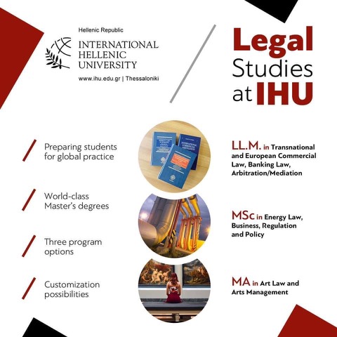 Το Διεθνές Πανεπιστήμιο της Ελλάδος ανακοίνωσε ότι ξεκίνησαν οι εγγραφές στα αγγλόφωνα προγράμματα μεταπτυχιακών σπουδών «LLM in Transnational and European Commercial Law, Banking Law, Arbitration/Mediation», «MSc in Energy Law, Business, Regulation and Policy» και «MA in Art Law and Arts Management».