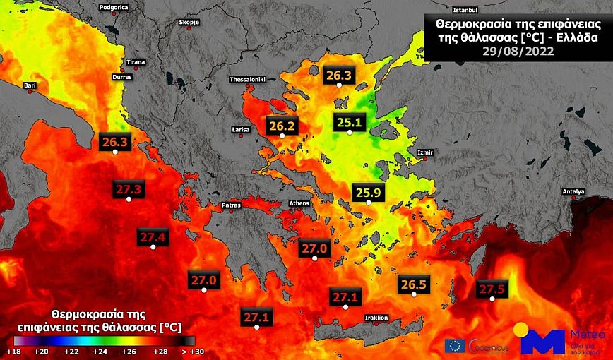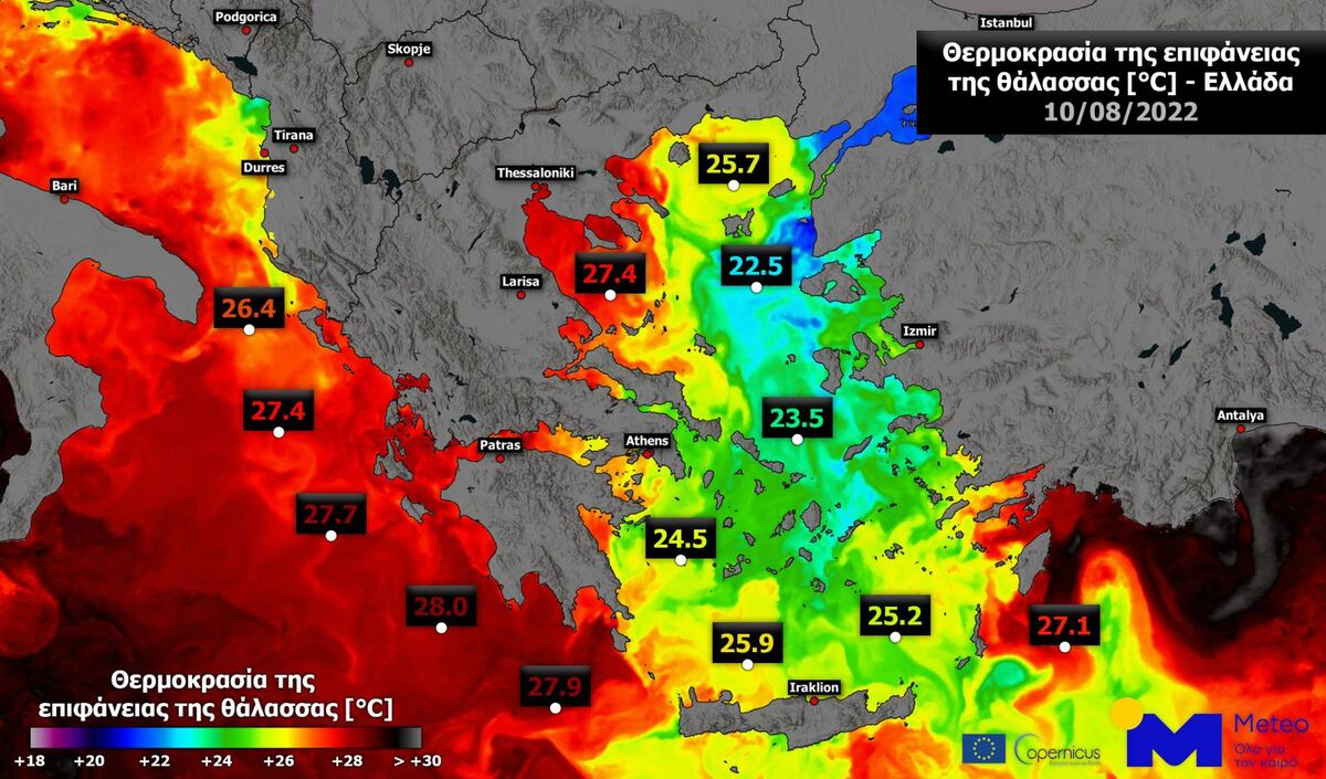 Η εξασθένηση των βορείων ανέμων στο Αιγαίο Πέλαγος στο δεύτερο μισό του Αυγούστου είχε σαν αποτέλεσμα την άνοδο της θερμοκρασίας της επιφάνειας της θάλασσας. Με βάση δορυφορικές μετρήσεις στις 10 Αυγούστου και στις 29 Αυγούστου 2022 αντίστοιχα για σύγκριση, παρουσιάστηκε σε αυτό το χρονικό διάστημα άνοδος των τιμών θερμοκρασίας στο Ανατολικό Αιγαίο και στις Κυκλάδες κατά περίπου 2,5 βαθμούς Κελσίου. Οι θερμοκρασίες κατά τις πρώτες ημέρες του Σεπτεμβρίου κυμαίνονται πλέον ελαφρώς πάνω από τα κανονικά για την εποχή επίπεδα.