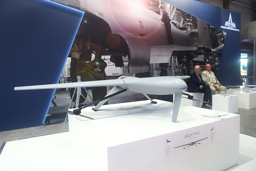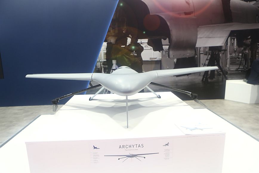 Το ομοίωμα του πρώτου ελληνικού drone, του τελευταίας τεχνολογίας UAV του προγράμματος «Αρχύτας», σε κλίμακα 1:2,5 φιλοξενείται στον εκθεσιακό χώρο της ΕΑΒ στη φετινή ΔΕΘ. Πρόκειται για ένα αεροσκάφος τύπου μικτής πτέρυγας, με σχεδιασμό που διαφέρει από όλα τα άλλα UAV, καθώς διαθέτει VTOL (κάθετη απογείωση και προσγείωση).