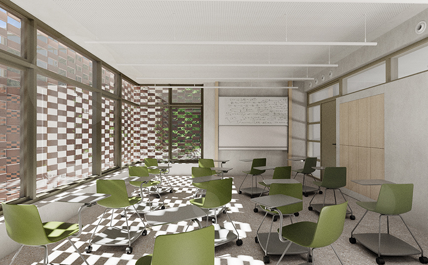 Τέλος, το κτίριο έχει σχεδιαστεί έτσι ώστε να επιτυγχάνει την καλύτερη δυνατή απόδοση βιωσιμότητας και βελτιστοποίησης του εσωτερικού περιβάλλοντος (θερμική άνεση και ποιότητα αέρα), αλλά και να καταναλώνει τη λιγότερη δυνατή ενέργεια. Αυτό επιτυγχάνεται με την επιλογή συστημάτων για εξοικονόμηση ενέργειας και μείωση των απωλειών, τον προσανατολισμό των αιθουσών διδασκαλίας στον άξονα βορρά-νότου και τη χρήση φιλικών προς το περιβάλλον υλικών, με στόχο την βέλτιστη ολοκληρωμένη απόδοση του κύκλου ζωής.