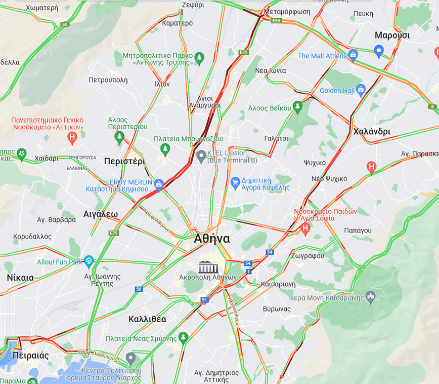 Η κίνηση είναι πολύ αυξημένη και στα δύο ρεύματα του Κηφισού, στην Πέτρου Ράλλη, την Πατησίων και την Αχαρνών. Στο κόκκινο η Κηφισίας, η Μεσογείων και η Κατεχάκη, κυρίως στο ρεύμα προς την Αθήνα. Καθυστερήσεις στη Βασιλέως Κωνσταντίνου, στην άνοδο της Βασιλίσσης Σοφίας και το ανοδικό ρεύμα της Συγγρού. Με αυξημένη κίνηση Σταδίου, Γαλατσίου και Βεΐκου, Βουλιαγμένης, Ηλιουπόλεως και Θησέως.