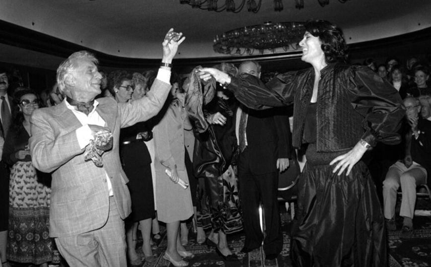 Η Παπά μαθαίνει στον Μπερνστάιν να χορεύει μπάλο στο πάρτι για την παρουσίαση της τραγωδίας «Βάκχες» στη Νέα Υόρκη, στις 3 Οκτωβρίου 1980.