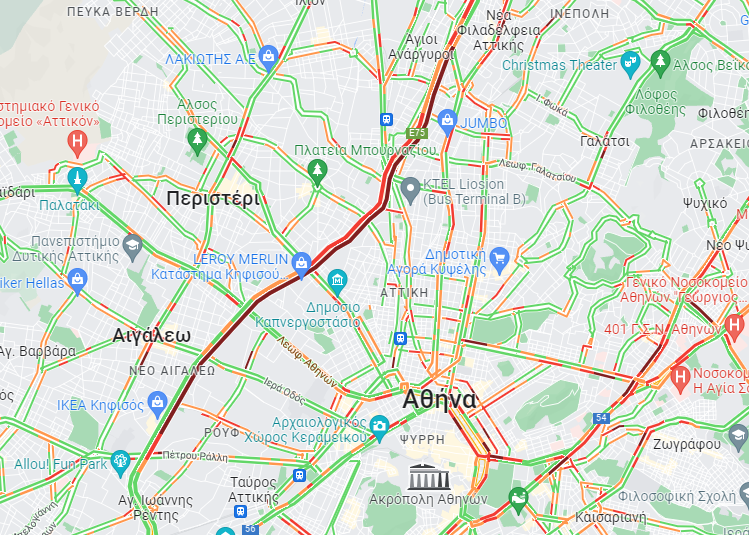 Η κυκλοφορία βρίσκεται στο «κόκκινο» όπως θα δείτε και στον live χάρτη της Google, με τα μεγαλύτερα προβλήματα να υπάρχουν από το ύψος του Ρουφ έως τη Νέα Φιλαδέλφεια.