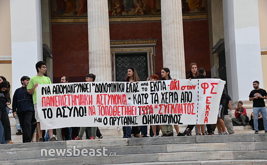 «Κάτω τα χέρια από το άσυλο» γράφουν οι φοιτητές στο πανό που κρατούν.