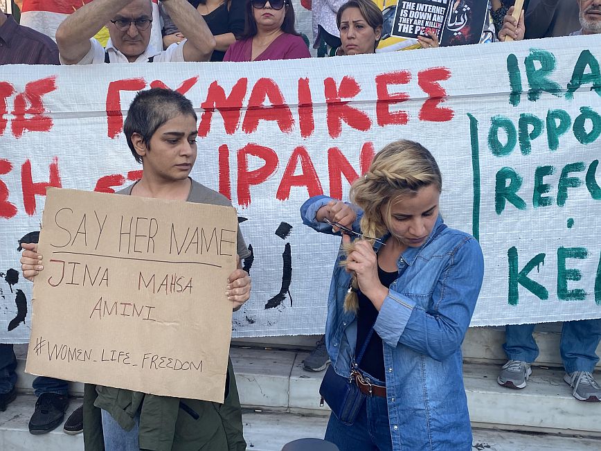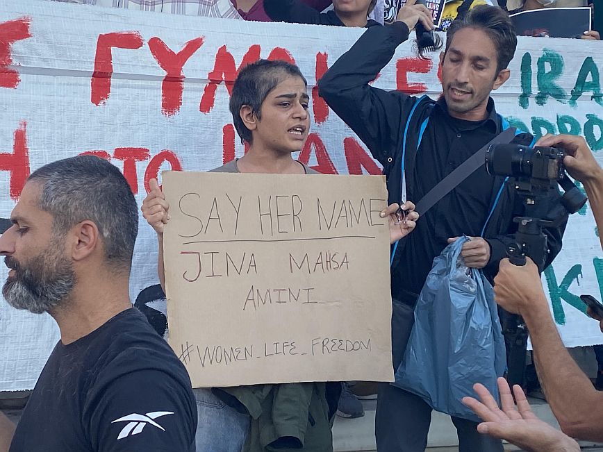 «Πείτε το όνομά της… Jina Masha Amini» γράφει ένα από τα πλακάτ που κρατούν στα χέρια τους Ιρανές γυναίκες που διαδηλώνουν στο Σύνταγμα μπροστά από τη Βουλή των Ελλήνων.