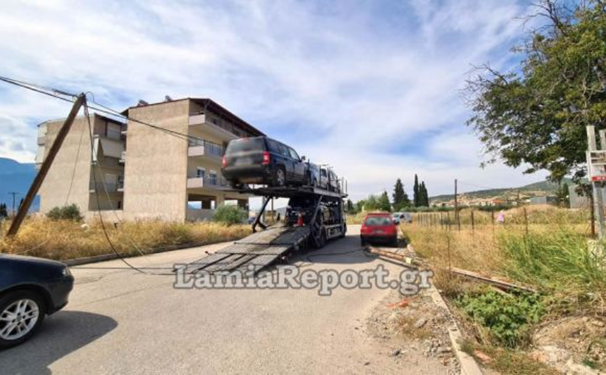 Τρεις κολώνες του ΟΤΕ «ξήλωσε» μία νταλίκα στη Λεωφόρο Ειρήνης στη Λαμία το μεσημέρι της Δευτέρας. Η νταλίκα, που ήταν φορτωμένη με αυτοκίνητα, παρέσυρε καλώδιο τηλεφωνικής εταιρείας, με αποτέλεσμα να ρίξει μία κολώνα και να ξεκολλήσει άλλες δύο από τη θέση τους.