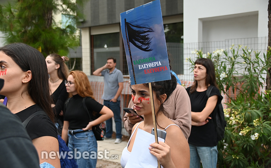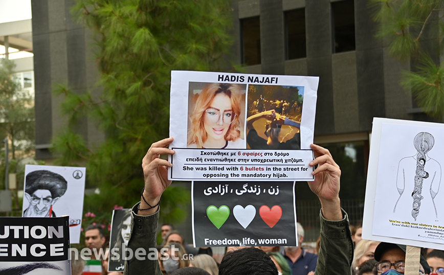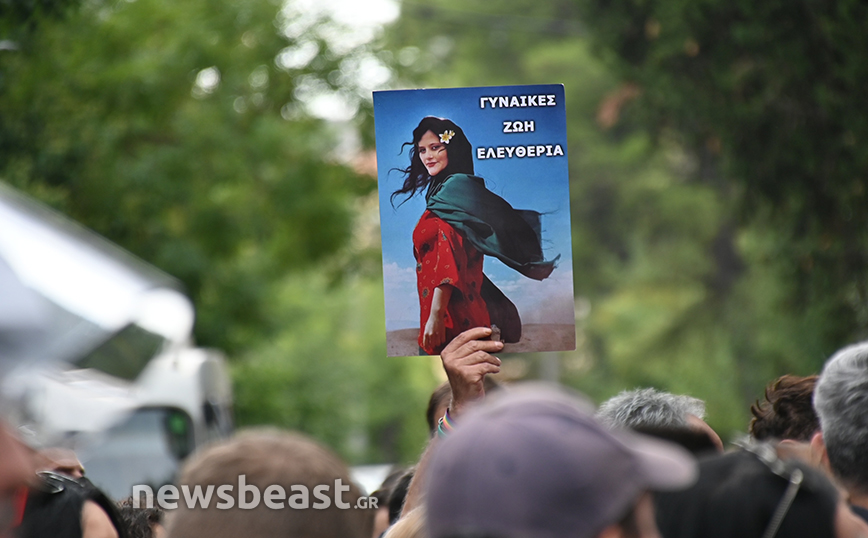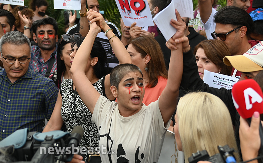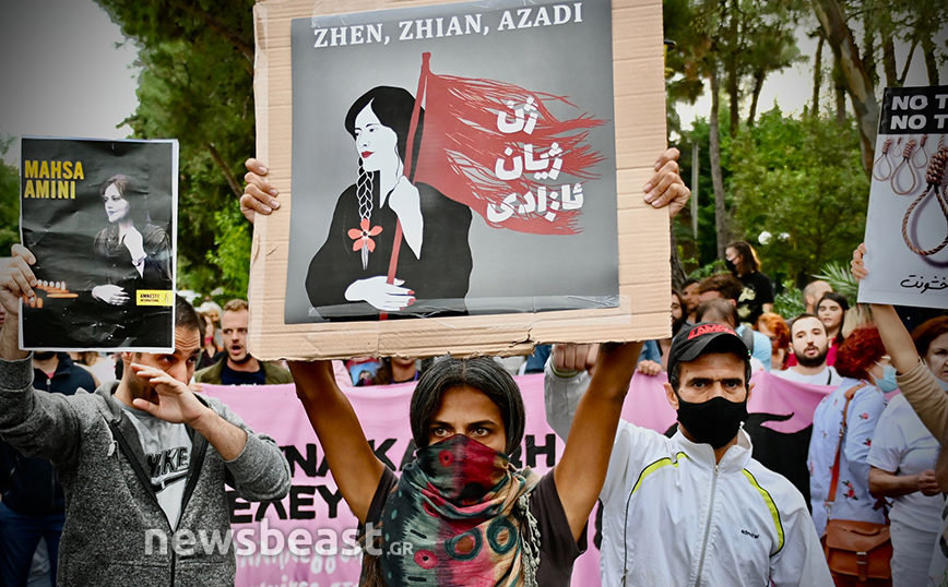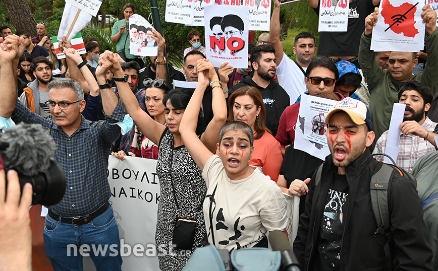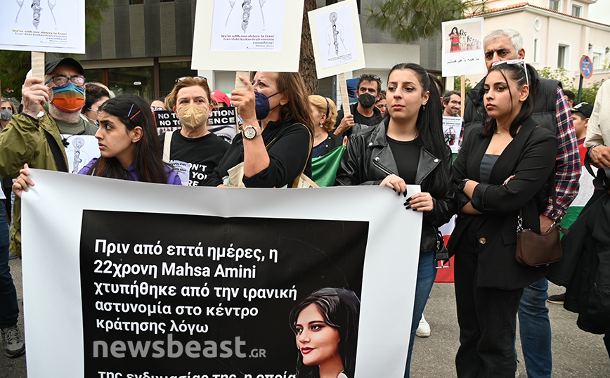 Με «ματωμένα δάκρυα» ζωγραφισμένα στα μάτια τους, πανό με συνθήματα για την ελευθερία και φωτογραφίες της 22χρονης Μάχσα Αμινί, που προσήχθη από την αστυνομία των ηθών στο Ιράν και βασανίστηκε γιατί δεν φόρεσε σωστά το χιτζάμπ, διαδηλώνουν έξω από την ιρανική πρεσβεία στην Αθήνα γυναίκες και άνδρες.