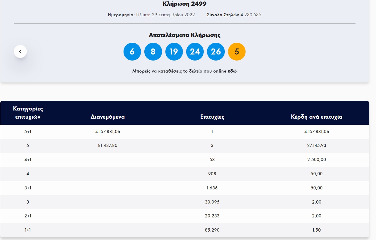 Στη σημερινή κλήρωση βρέθηκε ένας τυχερός με 5+1 επιτυχίες κερδίζοντας τα 4,1 εκατ. ευρώ.