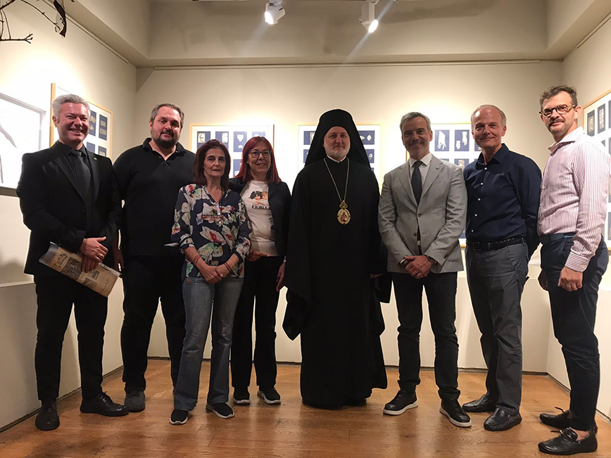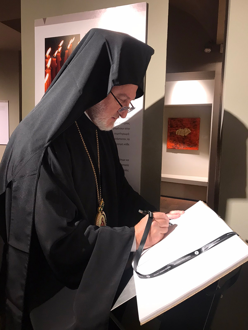 Κατά την ολιγοήμερη παραμονή του στη Θεσσαλονίκη ο Αρχιεπίσκοπος Αμερικής συμπεριέλαβε στο πρόγραμμά του και την επίσκεψη στην Αγιορειτική Εστία, ώστε να ξεναγηθεί στην έκθεση «Τάματα: Σῶμα πάσχον, ψυχή ἀλγοῦσα» της συλλογής της κυρίας Λόλας Νταϊφά αλλά και να δωρίσει από το προσωπικό του αρχείο, για τη βιβλιοθήκη της Αγιορειτικής Εστίας, τεύχος οθωμανικής εφημερίδας του 1926, η οποία στο πρωτοσέλιδό της έχει θέμα το Άγιον Όρος.