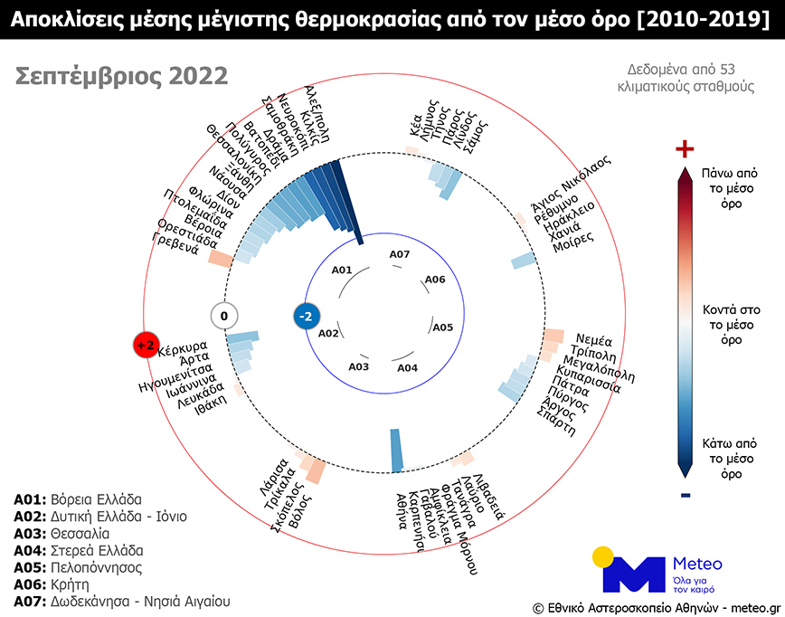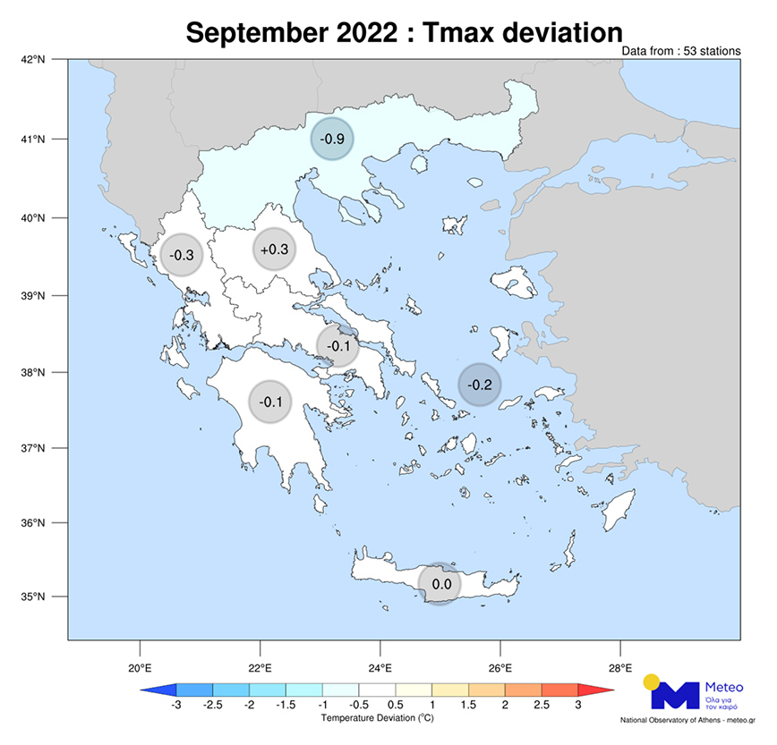 Οι μεγαλύτερες θερμοκρασιακές αποκλίσεις καταγράφηκαν στην Αλεξανδρούπολη, όπου η θερμοκρασία κυμάνθηκε έως και 8,4°C χαμηλότερα από τα κανονικά για την εποχή επίπεδα μεταξύ 19 και 27 Σεπτεμβρίου 2022, ενώ συνολικά τις 24 από τις 30 ημέρες του μήνα καταγράφηκαν αρνητικές αποκλίσεις. Στην Αθήνα και τη Θεσσαλονίκη καταγράφηκαν παρόμοιες αρνητικές αποκλίσεις (-1,1°C), με 17 ημέρες του μήνα να καταγράφονται αρνητικές αποκλίσεις στην Αθήνα και 18 ημέρες στη Θεσσαλονίκη.