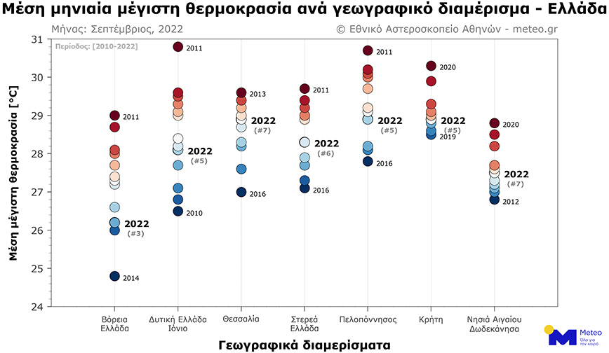 Η μέση μέγιστη θερμοκρασία τον φετινό Σεπτέμβριο ήταν οριακά υψηλότερη από τον Σεπτέμβριο του 2021 για τη Στερεά Ελλάδα, τη Θεσσαλία, τα νησιά του Αιγαίου και την Κρήτη, παρά το ιδιαίτερα ψυχρό διάστημα στα τέλη του μήνα.