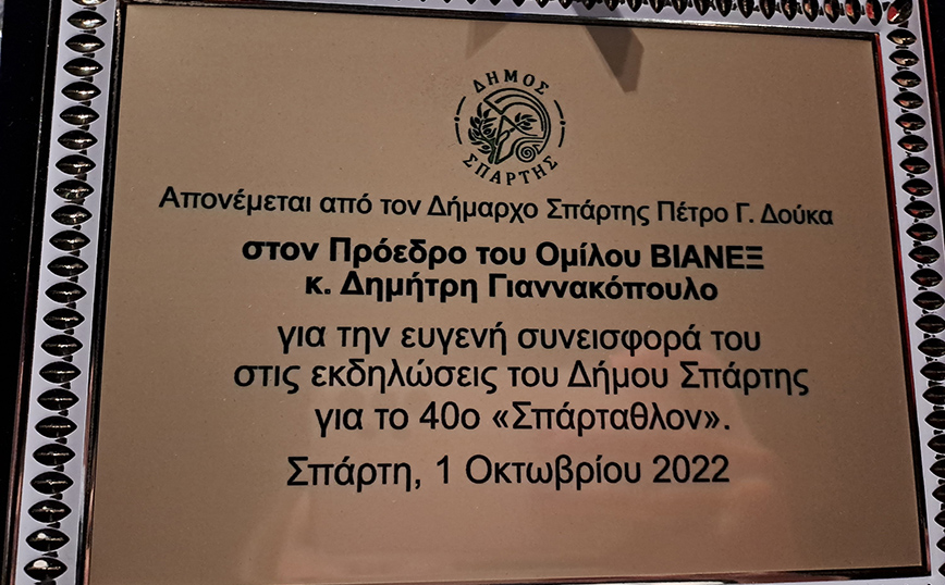Στο πλαίσιο αυτό, ο Δήμαρχος Σπάρτης κ. Πέτρος Δούκας απένειμε τιμητική πλακέτα στον κ. Δημήτρη Π. Γιαννακόπουλο, Πρόεδρο Δ.Σ. και Διευθύνοντα Σύμβουλο της ΒΙΑΝΕΞ, για την ευγενή συνεισφορά του στις εκδηλώσεις του Δήμου Σπάρτης για το 40ο ΣΠΑΡΤΑΘΛΟΝ. Την πλακέτα παρέλαβε εκ μέρους του η Διευθύντρια Εταιρικής Κοινωνικής Ευθύνης, κ. Όλγα Τριανταφύλλου.