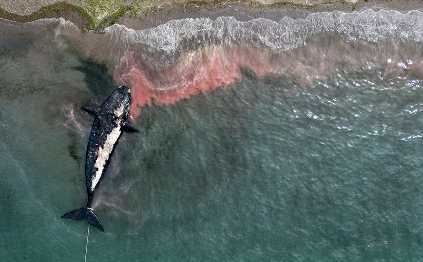 Μια νεκρή φάλαινα ρυμουλκείται από την ακτή κοντά στο Πουέρτο Μαδρίτ στην Αργεντινή. Οι επιστήμονες της Αργεντινής εκφράζουν την ανησυχία τους, καθώς τις τελευταίες ημέρες έχουν ανασυρθεί τουλάχιστον 13 νεκρές φάλαινες στην περιοχή. Εικάζουν ότι για το θάνατός τους ευθύνονται μικροφύκη.