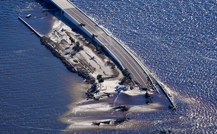 Οι εικόνες αφ’ υψηλού στη γέφυρα που οδηγεί στο νησί Sanibel από το Fort Myers της Φλόριντα, αποτελούν ένα μικρό δείγμα μόνο των καταστροφικών συνεπειών του τυφώνα Ίαν, που σάρωσε τα πάντα στο πέρασμά του την προηγούμενη εβδομάδα.