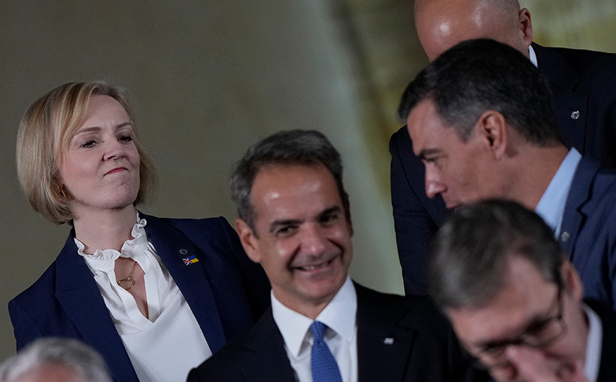 Η πρωθυπουργός της Βρετανίας Liz Truss, ο πρωθυπουργός της Ελλάδας Κυριάκος Μητσοτάκης και ο πρωθυπουργός της Ισπανίας Pedro Sanchez σε μια ομαδική φωτογραφία κατά τη διάρκεια της συνεδρίασης της Ευρωπαϊκής Πολιτικής Κοινότητας στο Κάστρο της Πράγας. Ηγέτες από περίπου 44 χώρες συγκεντρώθηκαν την Πέμπτη για να εγκαινιάσουν μια «Ευρωπαϊκή Πολιτική Κοινότητα» με στόχο την ενίσχυση της ασφάλειας και της οικονομικής ευημερίας σε ολόκληρη την ήπειρο, με τη Ρωσία να είναι η μόνη μεγάλη ευρωπαϊκή δύναμη που δεν έχει προσκληθεί.