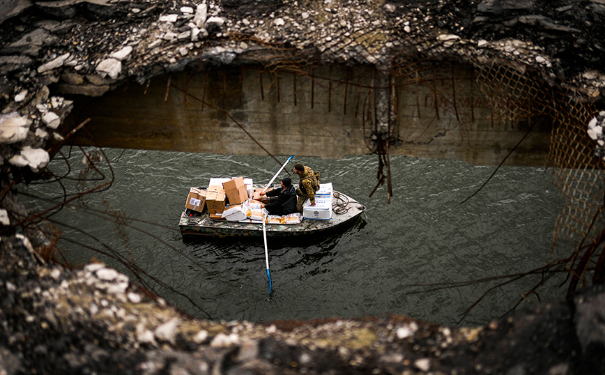 Ο Γιούρι Σαποβάλοφ κωπηλατεί μια βάρκα γεμάτη εμπορεύματα και μαζί με έναν Ουκρανό στρατιώτη διασχίζουν τον ποταμό Σίβερσκι-Ντόνετς κάτω από μια κατεστραμμένη γέφυρα στο Στάρι-Σάλτιβ στην Ουκρανία. Ο Σαποβάλοφ βοηθά καθημερινά τους ντόπιους να διασχίσουν τον ποταμό με αγαθά, καθώς η γέφυρα καταστράφηκε ως επί το πλείστον κατά τη διάρκεια των μαχών.