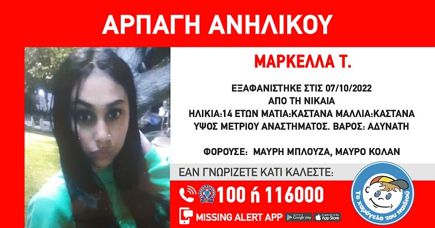 Στις 7/10/2022 και ώρα 21:30, απήχθη παρά τη θέληση της από ενήλικο άρρεν άτομο, από τη Νίκαια Αττικής, η Μαρκέλλα Τ., 14 ετών.