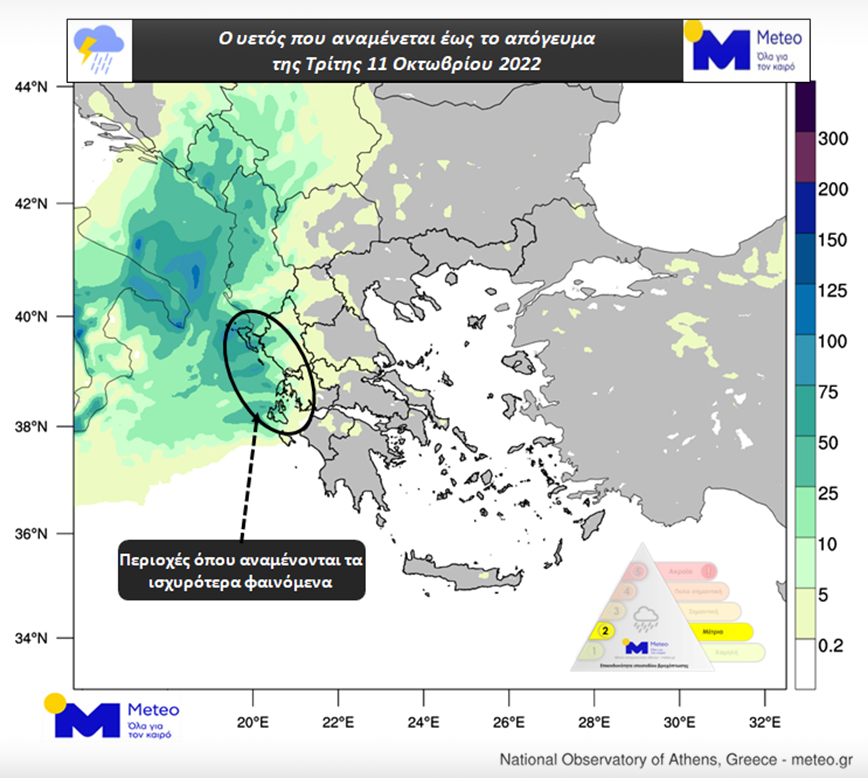 Το επεισόδιο βροχόπτωσης της Τρίτης 11/10 αναμένεται να είναι κατηγορίας 2. Σημειώνεται όμως ότι τα ισχυρά φαινόμενα αφορούν τα δυτικά τμήματα της χώρας.