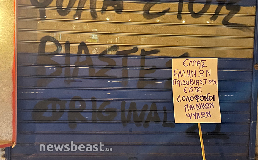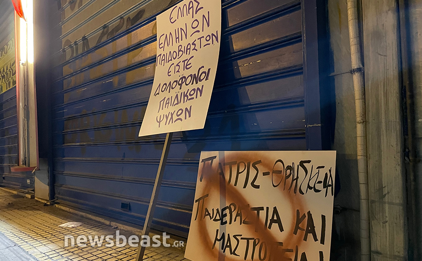 Επίσης, οι παρευρισκόμενοι έξω από το μαγαζί του Ηλία Μίχου κρατούσαν πλακάτ που έγραφαν «είστε δολοφόνοι παιδικών ψυχών» και «πατρίς – θρησκεία, παιδεραστία και μαστροπεία», αφού ο 53χρονος ασχολούνταν με τα κοινά και δήλωνε θεοσεβούμενος, ενώ είχε υπάρξει και ψάλτης και είχε φωτογραφηθεί δίπλα σε πλήθος κληρικών.
