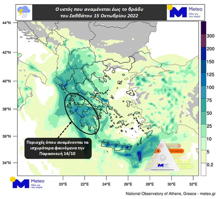 Τα φαινόμενα στο Ιόνιο, στη Δυτική Στερεά και στην Πελοπόννησο θα είναι κατά τόπους ισχυρά και υπάρχει πιθανότητα χαλαζοπτώσεων. Από τη νύχτα της Παρασκευής 14/10 προς Σάββατο 15/10 βροχές και καταιγίδες θα εκδηλωθούν κυρίως στη Θεσσαλία, στη Στερεά, στην Πελοπόννησο, στο Κεντρικό και Νότιο Αιγαίο και στην Κρήτη με τα ισχυρότερα φαινόμενα να αναμένονται στην Εύβοια και στην Κρήτη. Εξασθένηση των φαινομένων αναμένεται από το απόγευμα του Σαββάτου 15/10 με εξαίρεση την Κρήτη όπου οι θα συνεχίσουν να εκδηλώνονται σημαντικές βροχοπτώσεις. Στον σχετικό χάρτη παρουσιάζεται ο υετός που αναμένεται έως το βράδυ του Σαββάτου 15/10 καθώς και οι περιοχές των ισχυρότερων φαινομένων.