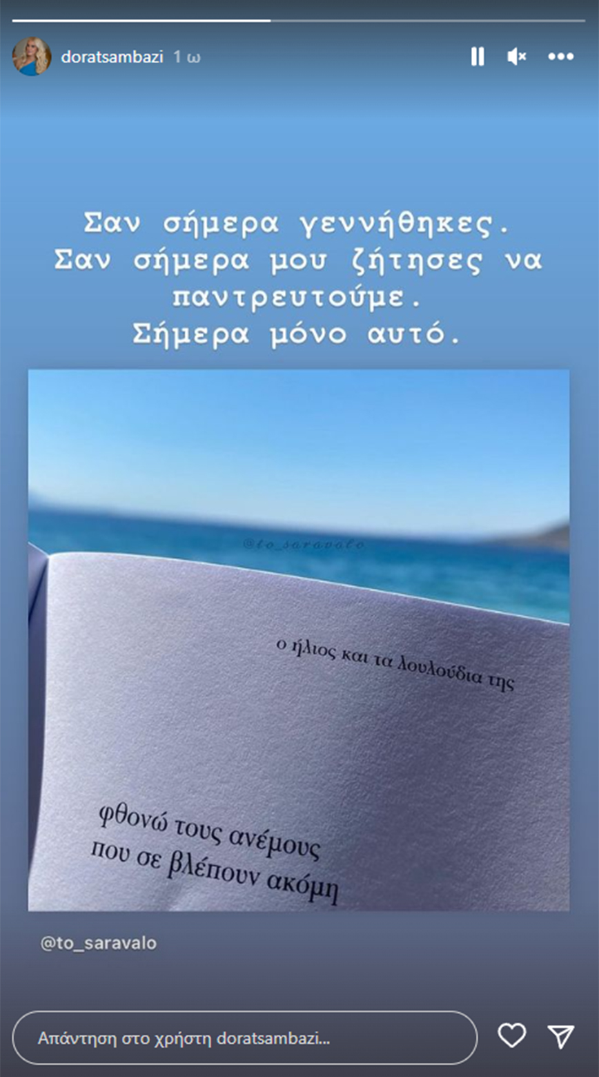 «Σαν σήμερα γεννήθηκες. Σαν σήμερα μου ζήτησες να παντρευτούμε. Σήμερα μόνο αυτό», έγραψε στον προσωπικό της λογαριασμό στο Instagram η Δώρα Τσαμπάζη ενώ συνόδεψε με το στίχο: «Φθονώ τους ανέμους που σε βλέπουν ακόμη».