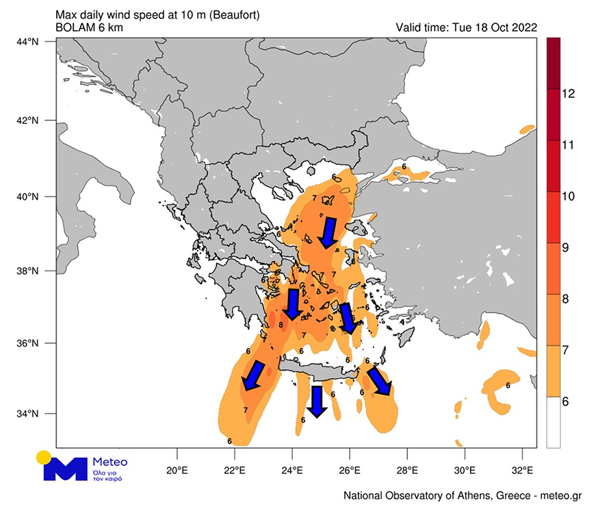 Θυελλώδεις άνεμοι πνέουν και σήμερα Τρίτη 18/10, με τις εντάσεις τους να φτάνουν τοπικά τα 8 μποφόρ σύμφωνα με τα στοιχεία του Εθνικού Αστεροσκοπείου Αθηνών/meteo.gr.