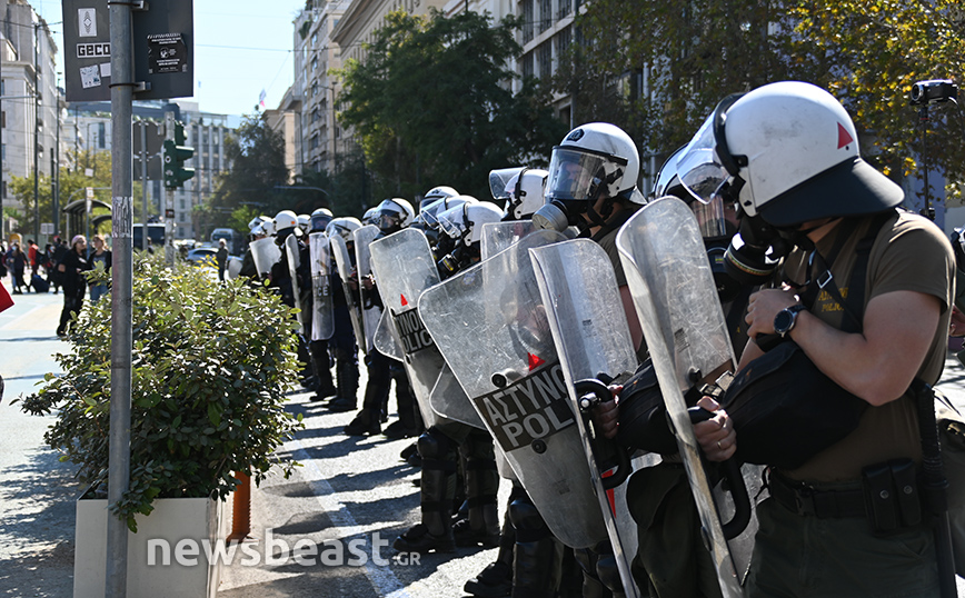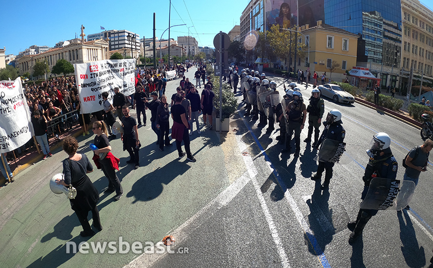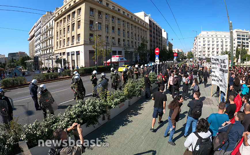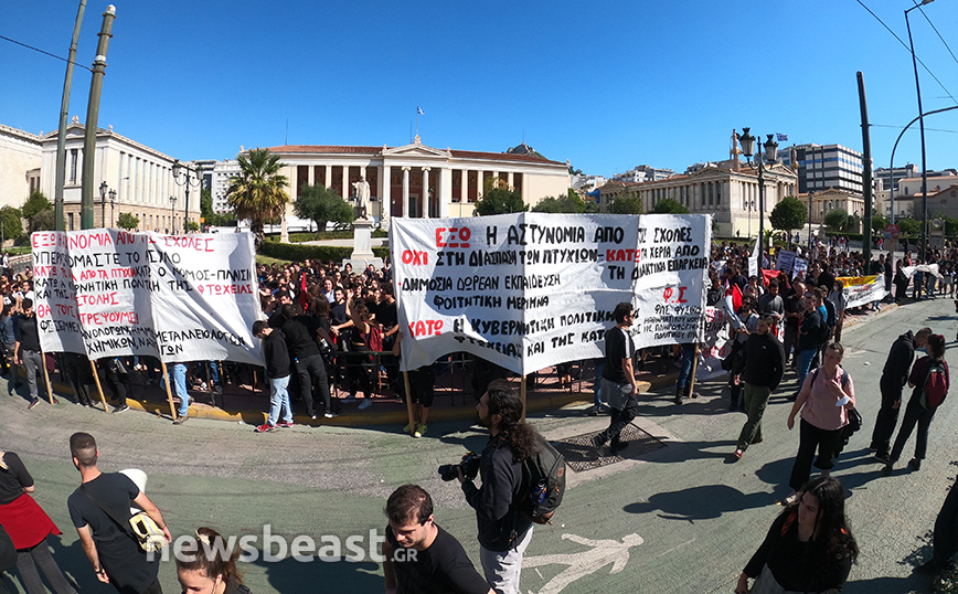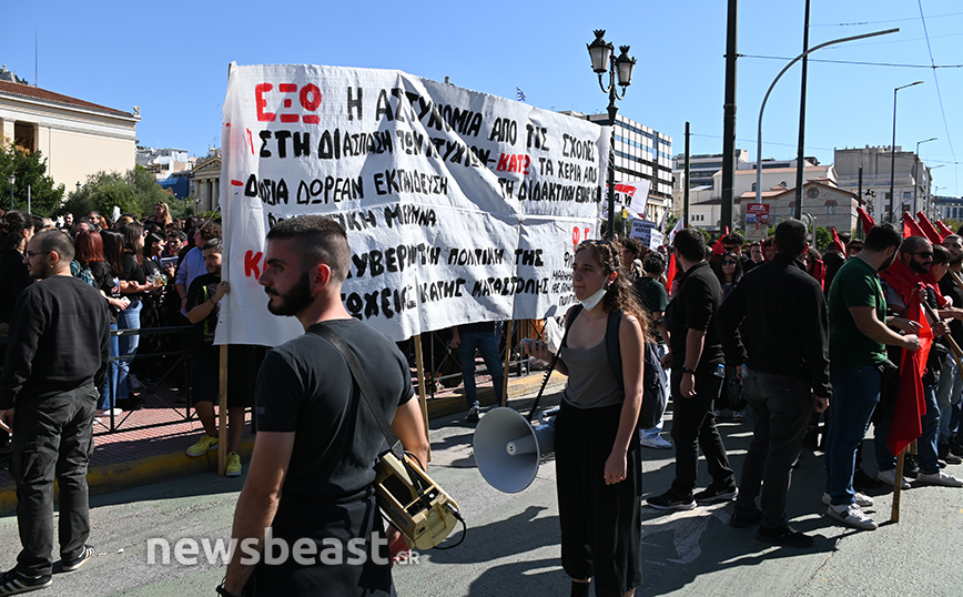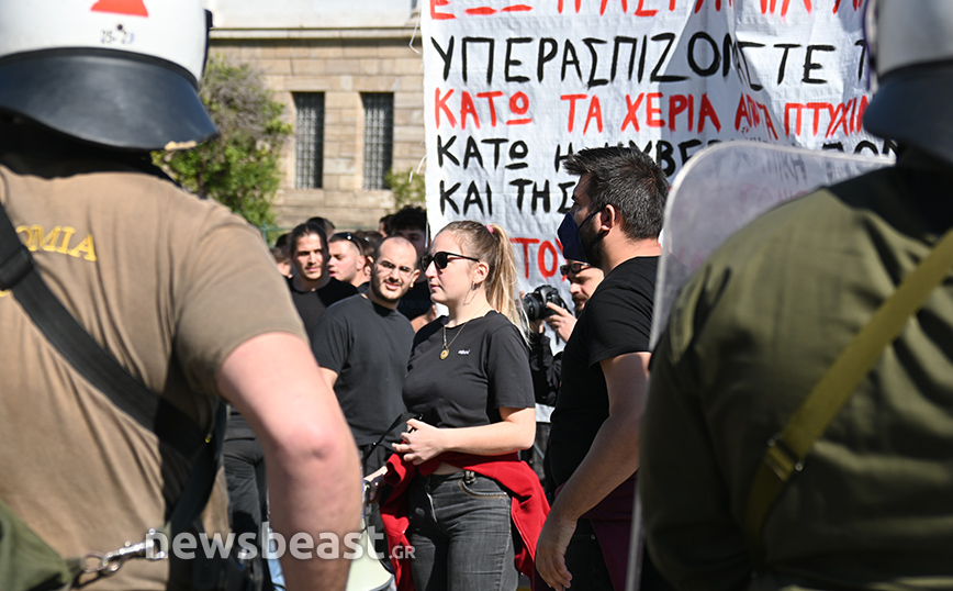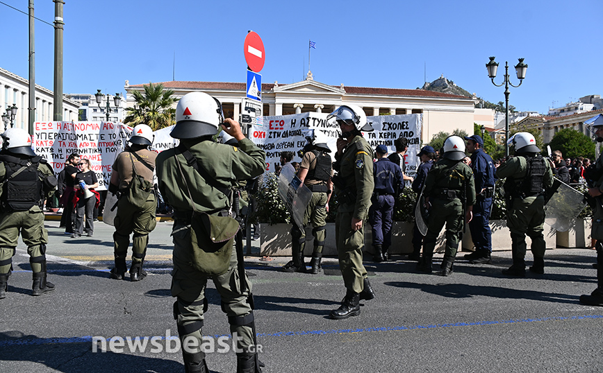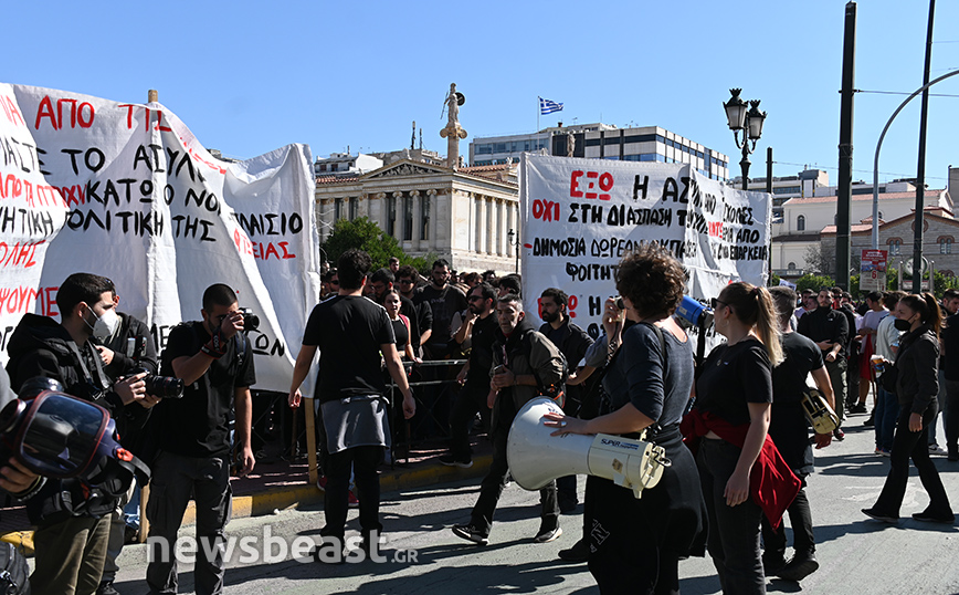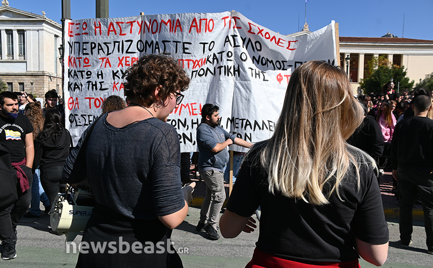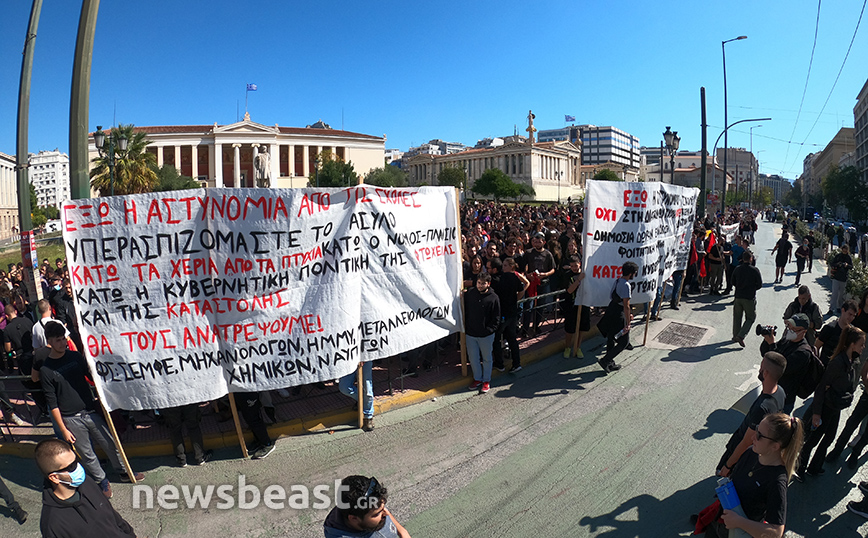 Οι φοιτητές κρατούν πανό και πλακάτ που γράφουν «Έξω η αστυνομία από τις σχολές, υπερασπιζόμαστε το άσυλο» και φωνάζουν σχετικά συνθήματα.