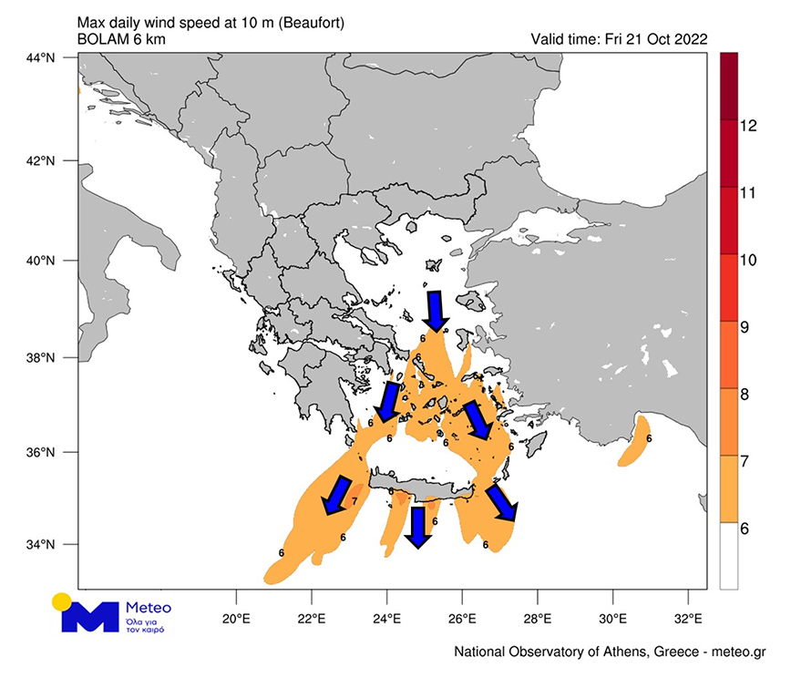 Ενισχυμένοι θα είναι σήμερα οι βόρειοι άνεμοι στο Αιγαίο με τις εντάσεις τους να φτάνουν τοπικά τα 7-8 μποφόρ σύμφωνα με τα προγνωστικά στοιχεία του Εθνικού Αστεροσκοπείου Αθηνών/meteo.gr. Στον παρακάτω προγνωστικό χάρτη παρουσιάζονται οι επικρατούσες διευθύνσεις και οι εκτιμώμενες μέγιστες εντάσεις των ανέμων κατά τη διάρκεια της Παρασκευής 21/10.