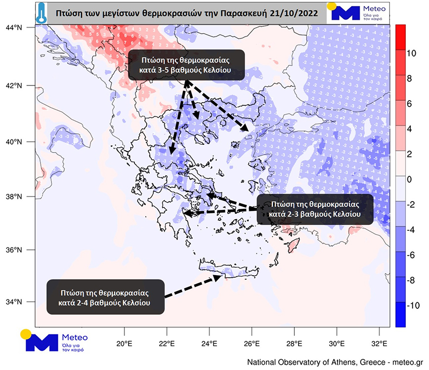 Παράλληλα, πρόσκαιρη πτώση θα παρουσιάσει η θερμοκρασία στα ηπειρωτικά και στο Αιγαίο, με έμφαση κυρίως στην Κεντρική και Βόρεια Ελλάδα όπου κατά τόπους θα είναι της τάξης των 5 βαθμών. Στον προγνωστικό χάρτη που ακολουθεί αποτυπώνεται η εκτιμώμενη πτώση των μεγίστων θερμοκρασιών της Παρασκευής 21/10 σε σχέση με τις μέγιστες τιμές που σημειώθηκαν την Πέμπτη 20/10.