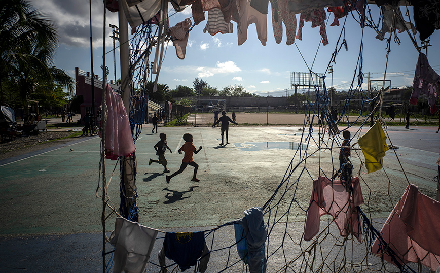 Παιδιά τρέχουν μπροστά από ένα δοκάρι που χρησιμοποιείται για να κρεμάσουν ρούχα στη δημόσια πλατεία Ούγκο Τσάβες που μετατράπηκε σε καταφύγιο για οικογένειες, όταν αναγκάστηκαν να εγκαταλείψουν τα σπίτια τους λόγω συγκρούσεων μεταξύ ένοπλων συμμοριών στο Πορτ-ο-Πρενς στην Αϊτή.