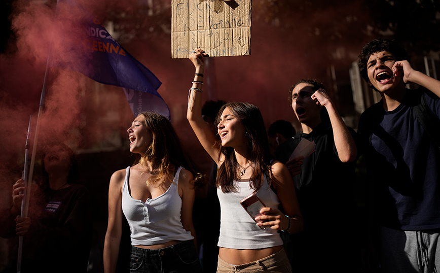 Διαδηλωτές φωνάζουν κατά τη διάρκεια διαδήλωσης, την περασμένη Τρίτη στη Μασσαλία, στη νότια Γαλλία. Η Γαλλία βρίσκεται στη δίνη απεργιών στις μεταφορές και διαμαρτυριών για αύξηση μισθών, οι οποίες συμπίπτουν με τις πολυήμερες απεργίες μισθωτών που έχουν ήδη παραλύσει τα διυλιστήρια και τις αποθήκες καυσίμων, προκαλώντας σημαντικές ελλείψεις βενζίνης σε όλη τη χώρα.