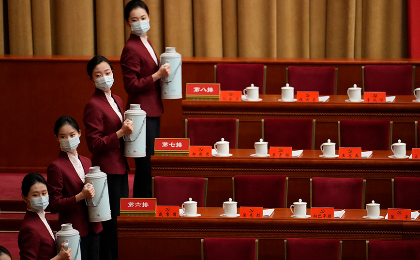 Οικοδέσποινες ετοιμάζουν ποτά στη Μεγάλη Αίθουσα του Λαού πριν από την τελετή έναρξης του 20ου Εθνικού Συνεδρίου του κυβερνώντος Κομμουνιστικού Κόμματος της Κίνας στο Πεκίνο. Η Κίνα εγκαινιάζει την Κυριακή ένα συνέδριο του κόμματος που πραγματοποιείται δύο φορές την δεκαετία, στο οποίο ο ηγέτης Σι Τζινπίνγκ αναμένεται να λάβει μια τρίτη πενταετή θητεία που θα σπάσει το πρόσφατο προηγούμενο και θα καθιερωθεί ως ο αναμφισβήτητα ισχυρότερος Κινέζος πολιτικός μετά τον Μάο Τσετούνγκ.