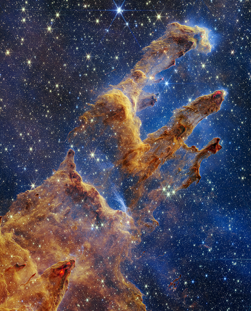 Αυτή η εικόνα που κυκλοφόρησε από τη NASA την περασμένη Τετάρτη δείχνει τους Στύλους της Δημιουργίας, που καταγράφηκαν από το διαστημικό τηλεσκόπιο James Webb σε προβολή κοντά στο υπέρυθρο φως. Μια εικόνα που στην κυριολεξία προκαλεί δέος ως προς το τι υπάρχει στο σύμπαν εκεί έξω… (*η φωτογραφία παρέχεται αποκλειστικά από τη NASA)
