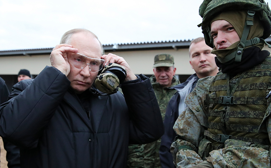 Ο Ρώσος πρόεδρος Βλαντιμίρ Πούτιν φοράει προστατευτικά γυαλιά καθώς επισκέπτεται ένα στρατιωτικό εκπαιδευτικό κέντρο της Δυτικής Στρατιωτικής Περιφέρειας για κινητοποιημένους εφέδρους στην περιοχή Ριαζάν στη Ρωσία.