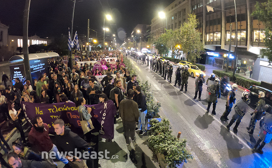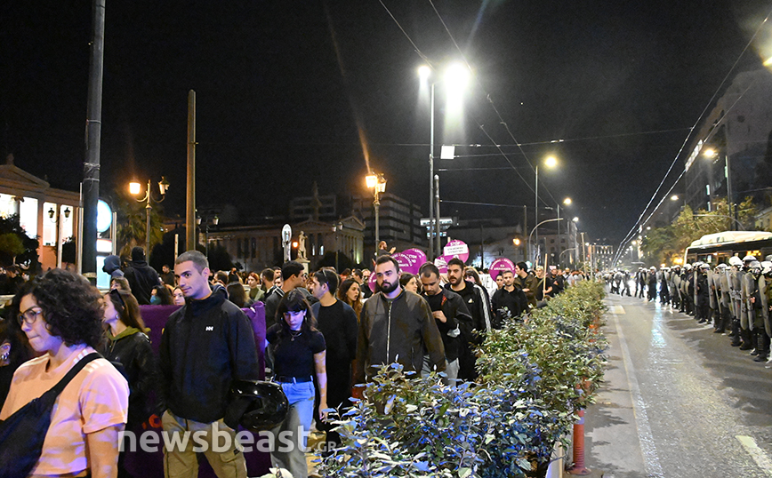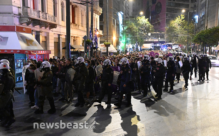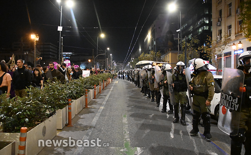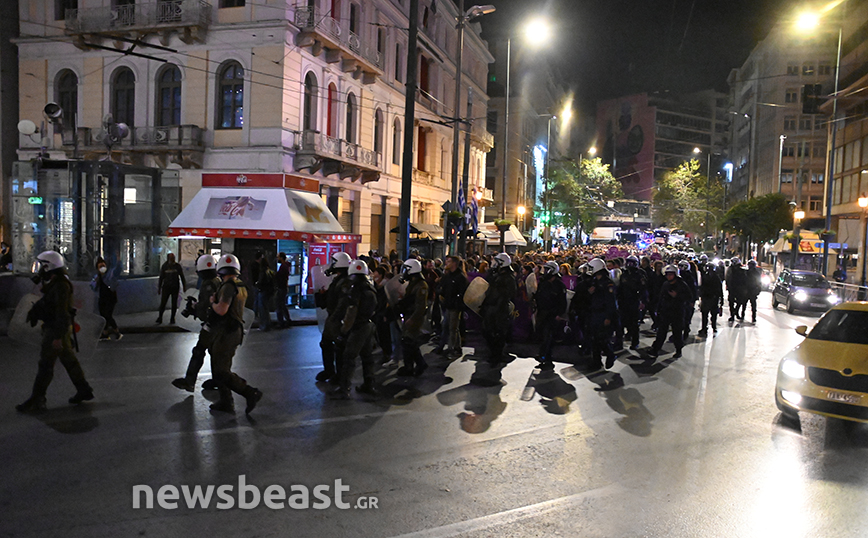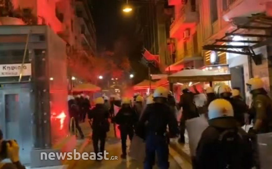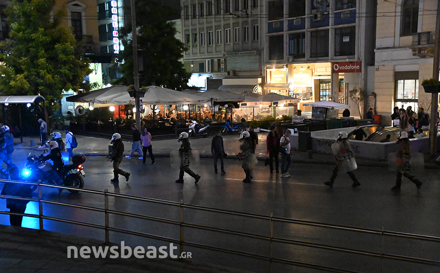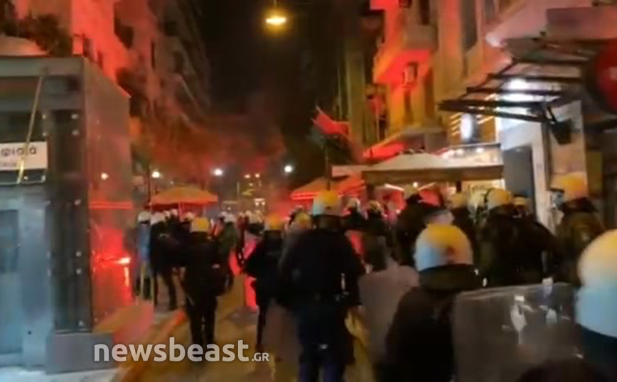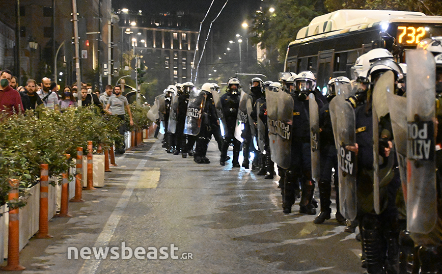 Εκεί, μόλις ολοκληρώθηκε η πορεία, ορισμένοι διαδηλωτές πέταξαν φωτοβολίες προς τα ΜΑΤ και εκείνοι απάντησαν με κρότου λάμψης και το επεισόδιο έληξε άμεσα.