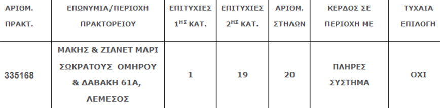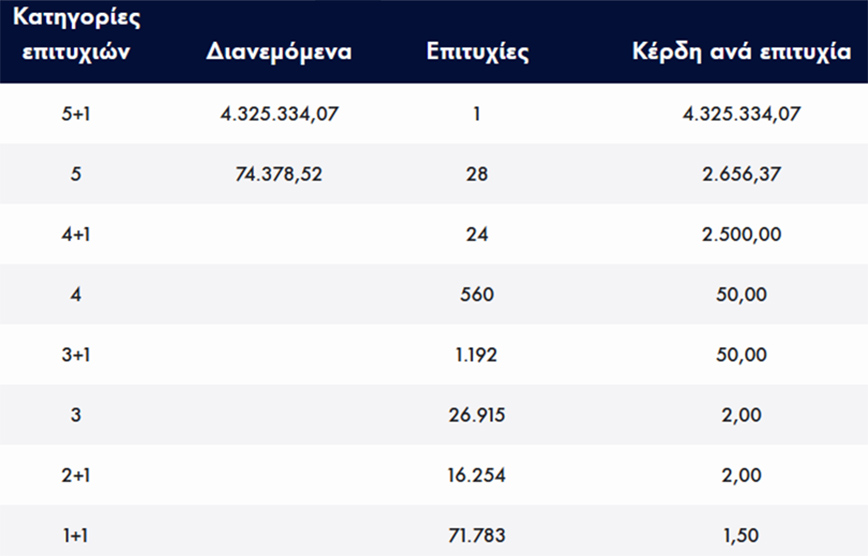 Στην δεύτερη κατηγορία (5άρια) βρέθηκαν 28 επιτυχίες, οι οποίες κερδίζουν το ποσό των 2.656,37 ευρώ. Στην κλήρωση της Πέμπτης 27/10 το ποσό που θα μοιραστούν οι τυχεροί της 1ης κατηγορίας είναι 600.000 ευρώ τουλάχιστον.