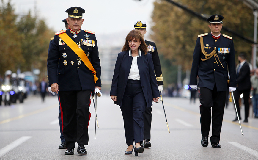 Νωρίτερα, η Πρόεδρος της Δημοκρατίας, Κατερίνα Σακελλαροπούλου, περπάτησε στην οδό Μεγάλου Αλεξάνδρου και χαιρέτησε τον κόσμο που έχει συγκεντρωθεί από νωρίς για να παρακολουθήσει την στρατιωτική παρέλαση.
