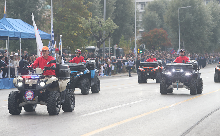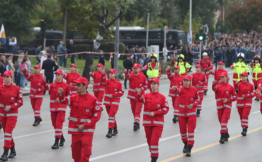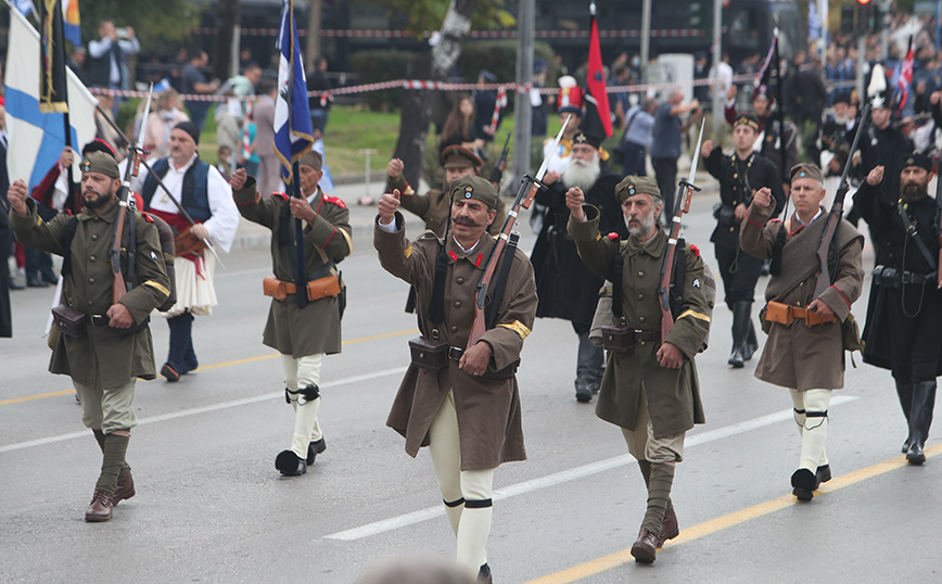 Η παρέλαση άνοιξε με τη Φιλαρμονική του Δήμου Θεσσαλονίκης και στη συνέχεια παρήλασαν τα μέλη της Ομοσπονδίας Αναπήρων και Θυμάτων Πολέμου Β. Ελλάδος – Σύλλογος «ΚΟΜΑΝΤΟΣ» 74 και ακολούθησε ο Σύλλογος Απογόνων Μακεδονομάχων «Ο ΠΑΥΛΟΣ ΜΕΛΑΣ», φωνάζοντας “ΕΛΑΣ ΕΛΑΣ Μακεδονία” ενώ στη συνέχεια πήραν σκυτάλη τα μέλη του Ελληνικού Ερυθρού Σταυρού, εκπρόσωποι πολιτιστικών συλλόγων, αλλά και μαθητές σχολείων της Θεσσαλονίκης.
