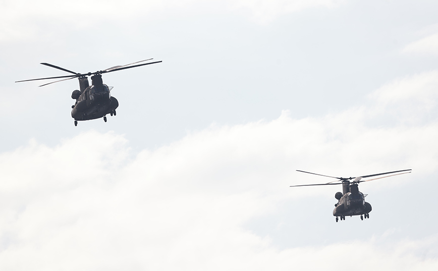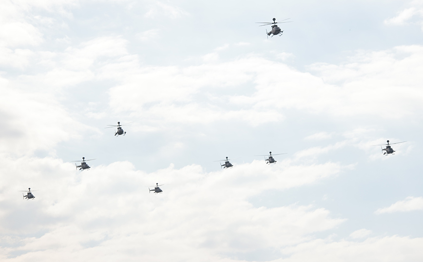 Πάνω από το χώρο της παρέλασης πέταξαν αεροσκάφη και ελικόπτερα της Πολεμικής Αεροπορίας (μεταξύ άλλων μαχητικά F-16 και F-4), καθώς και ελικόπτερα της Αεροπορίας Στρατού (Apache, Chinook, Kiowa Warrior κά), του Πολεμικού Ναυτικού (Sikorsky S-70) και των Σωμάτων Ασφαλείας.