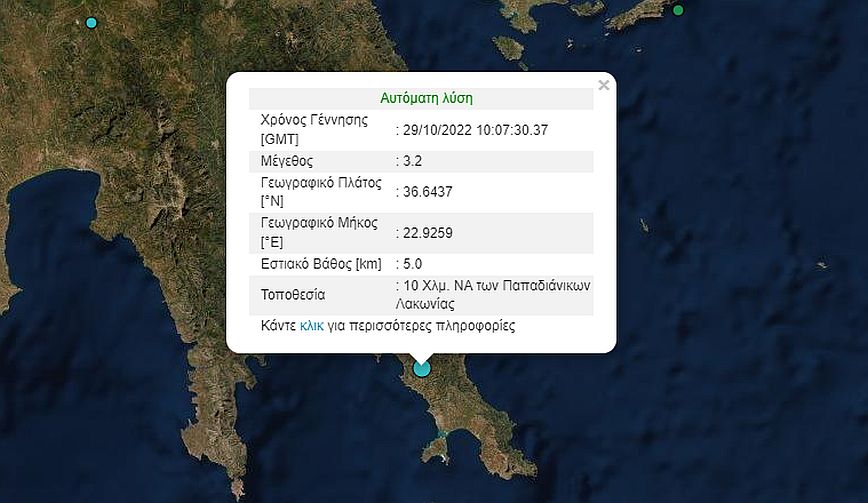 Σεισμική δόνηση μεγέθους 3,2 βαθμών της κλίμακας Ρίχτερ σημειώθηκε το μεσημέρι του Σαββάτου στη Λακωνία και πιο συγκεκριμένα στα Παπαδιάνικα.